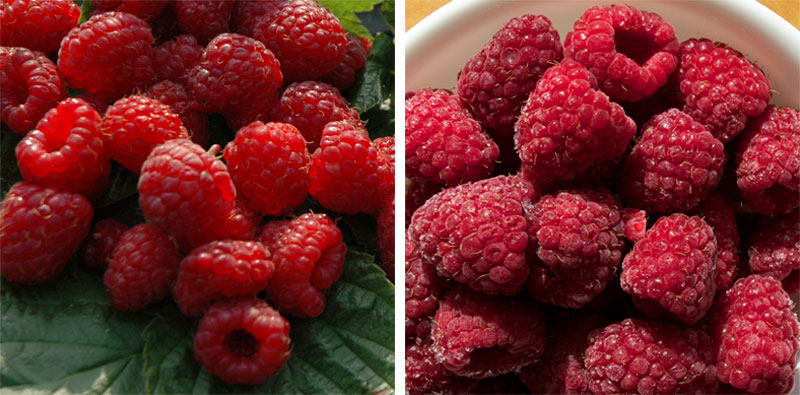 Red raspberries are best harvested when they are shiny, deep red with attached green caps at the top end, firm, plump, and free of sand and mould. Unlike many fruits, unripe raspberries do not ripen after they are picked! They are a highly perishable fruit so sort and remove any crushed, damaged or bruised berries so they do not spoil others. If you need them to look perfect when you use them later, gently tip them out of the container and spread in a single layer on a plate. Cover with a dry paper towel (to absorb any excess moisture), then plastic wrap and refrigerate. The single layer will prevent stacked raspberries from crushing ones below them. They will usually last a couple days in the refrigerator stored at between 2-4 ºC or up to 1 year in the freezer. Freezing raspberries is one of the best ways to preserve the original color, flavour, and nutritive value. To freeze the berries, spread them out on a plate or baking tray for about 30 minutes until frozen solid. Transfer them to heavy freezer bags with no excess air, and seal tight. To conserve space in the freezer, we often juice and strain some of our fresh berries, and then freeze the puree in canning jars.